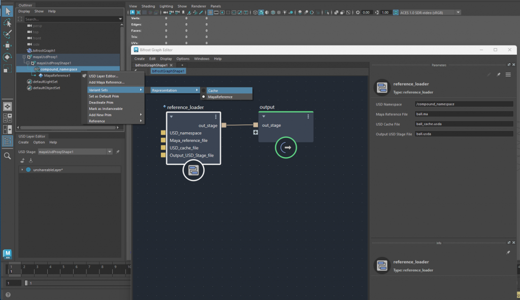 And somehow I found absolutely brilliant Bifrost discord server and one guy offered very elegant solution for Maya USD: small Bifrost network that allows you to switch between USD Cache and Maya Reference right from the outliner, using USD Variants.